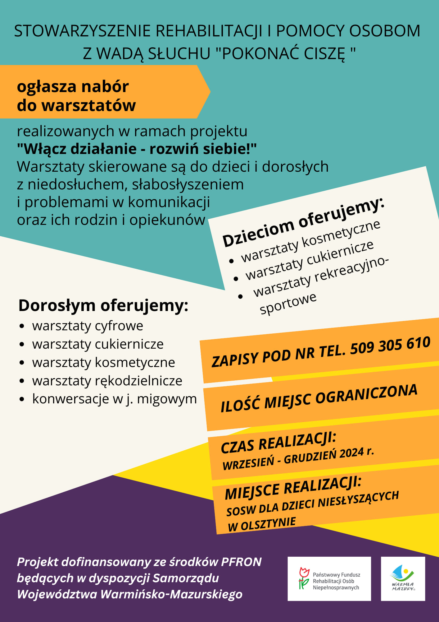 Zapisy można dokonać pod nr telefonu 509 305 610 lub w siedzibie Stowarzyszenia przy SOSW dla Dzieci Niesłyszących.
